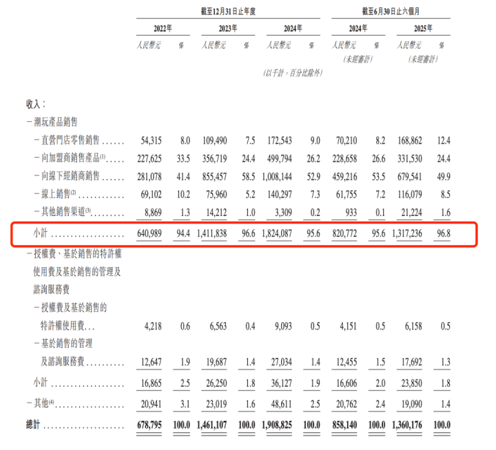 从行业大环境来看,TOPTOY选择此时上市,正赶上国内潮玩行业的发展红利期。作为行业龙头的泡泡玛特,近年来股价持续走高,2025年8月总市值首次突破4000亿港元大关;业绩端同样表现亮眼,其2025年半年报显示,上半年营收138.8亿元,同比增长204.4%,经调整净利润47.1亿元,同比增长362.8%,半年营收突破百亿,净利润已超2024年全年,充分印证了潮玩行业的增长潜力。